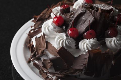 Whip cream and sugar till light and fluffy. Sandwich the two layers of cake with whipped cream and chopped cherries. Top with whipped cream and cherries; sprinkle generously with grated chocolate. Chill and serve.