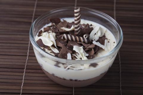 For the chocolate layer, while it is warm, add in the chopped dark chocolate and mix well till the chocolate melts. Cool the mixture and spoon into the glasses over the vanilla layer. Smoothen the top and set in the fridge. Garnishing suggestion: Sprinkle white and chocolate curls over and serve