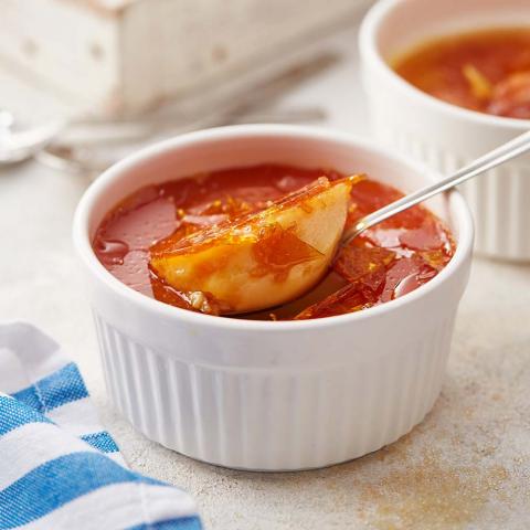 Add 150g of sugar to a pan and let it caramelize on low flame for about 3 minutes till it turns yellowish- brown colour.