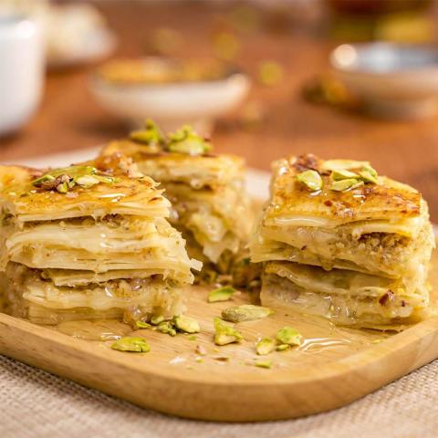 Take a baking tray and spread the Melted butter and layer out the sheets one by one top up the layers in sheets and now spread the mix nuts in a layer and replace the sheets a gain and in the end sheet will be the end and put a diamond cut and bake it in 180’c for 50 minutes and keep to a side.
