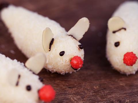 Use silver balls for the eyes, glazed cherry pieces for the noses, almonds for the ears and noodle strands for the tails. Leave in a cool place.