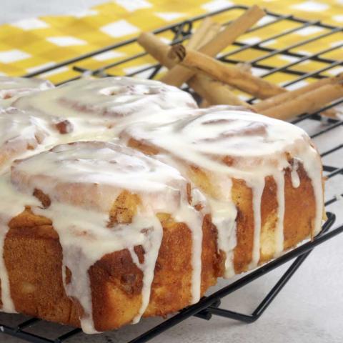 Coat the bottom of the baking pan with butter. Place cinnamon roll slices close together in the pan and let rise the dough is doubled.