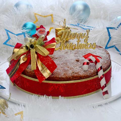 பக்கங்களை சிவப்பு நிற நாடாவால் அலங்கரிக்கவும். மேற்பகுதியை ஐசிங் சுகரால் மூடவும். கிறிஸ்மஸ் அலங்காரத்தால் அலங்கரிக்கவும்.