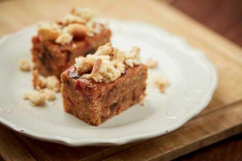 பேக்கிங் ஒயில் பேப்பரினை இட்டு கேக் தட்டில் இடவும். பேக்கிங் தட்டில் கலவையை இடவும். ஒரு மணித்தியாலத்திற்கு அல்லது இறுகும் வரை 150 பாகை செல்சியஸில் பேக் செய்யவும்.