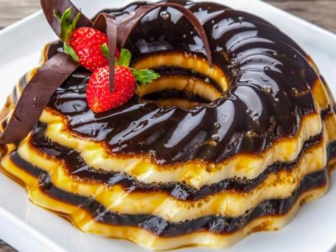ஒரு கப் நீரில் ஜெலட்டினை அமிழ்த்தவும். சுடுநீரில் கரைக்கவும். மிகுதியாகவுள்ள நீரைச் சூடாக்கி கோப்பியைக் கரைக்கவும். நீரை இரண்டு சம பகுதிகளாகப் பிரிக்கவும்.
