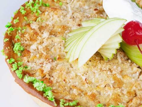 தயாரிக்கப்பட்டுள்ள பிளான் பேசில் கரண்டியால் ஊற்றி 15 நிமிடங்களுக்கு பேக் செய்யவும். தேங்காய் துண்டுகளை தூவவும். இன்னும் 10 நிமிடங்களுக்கு பேக் செய்யவும்.
